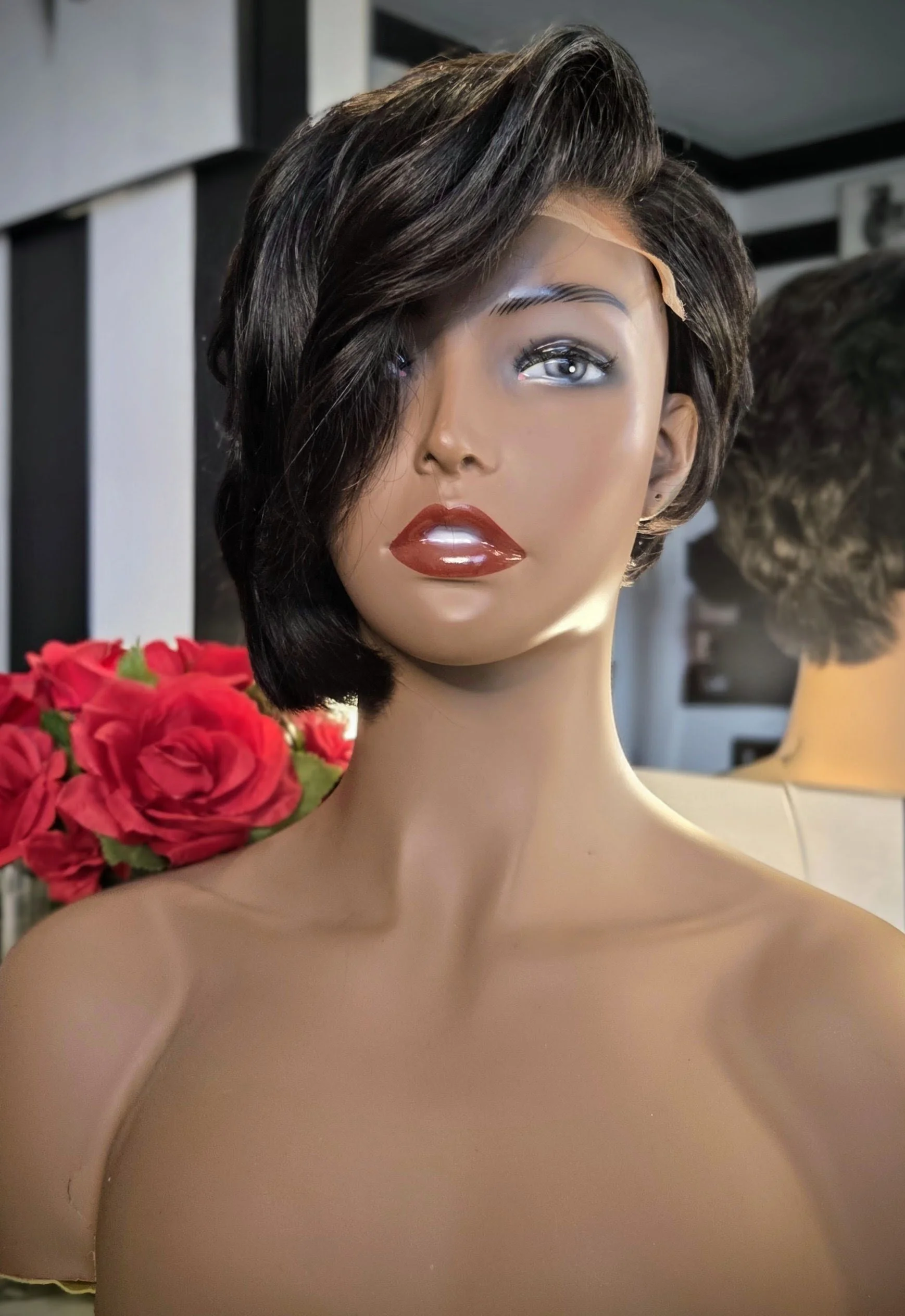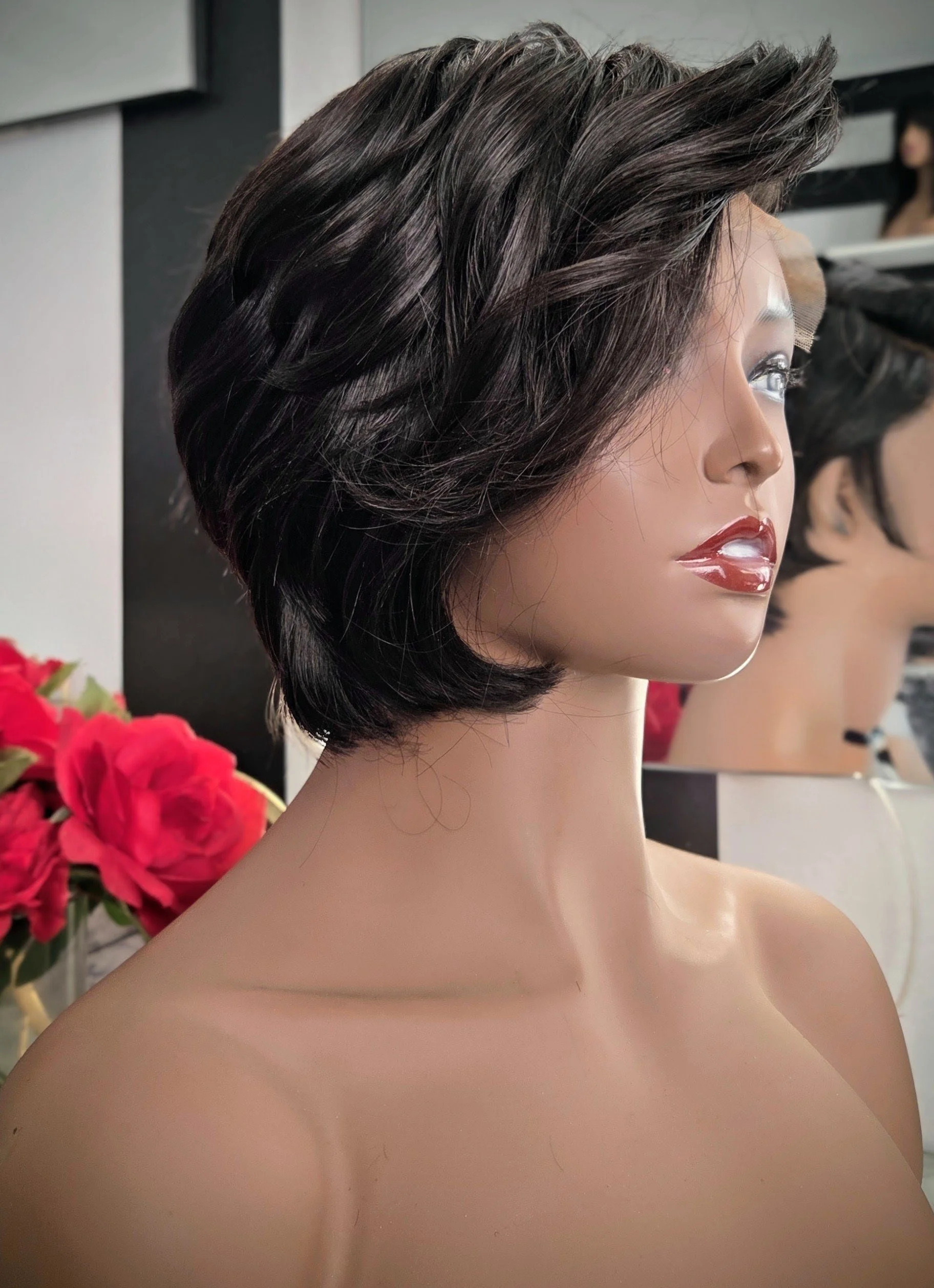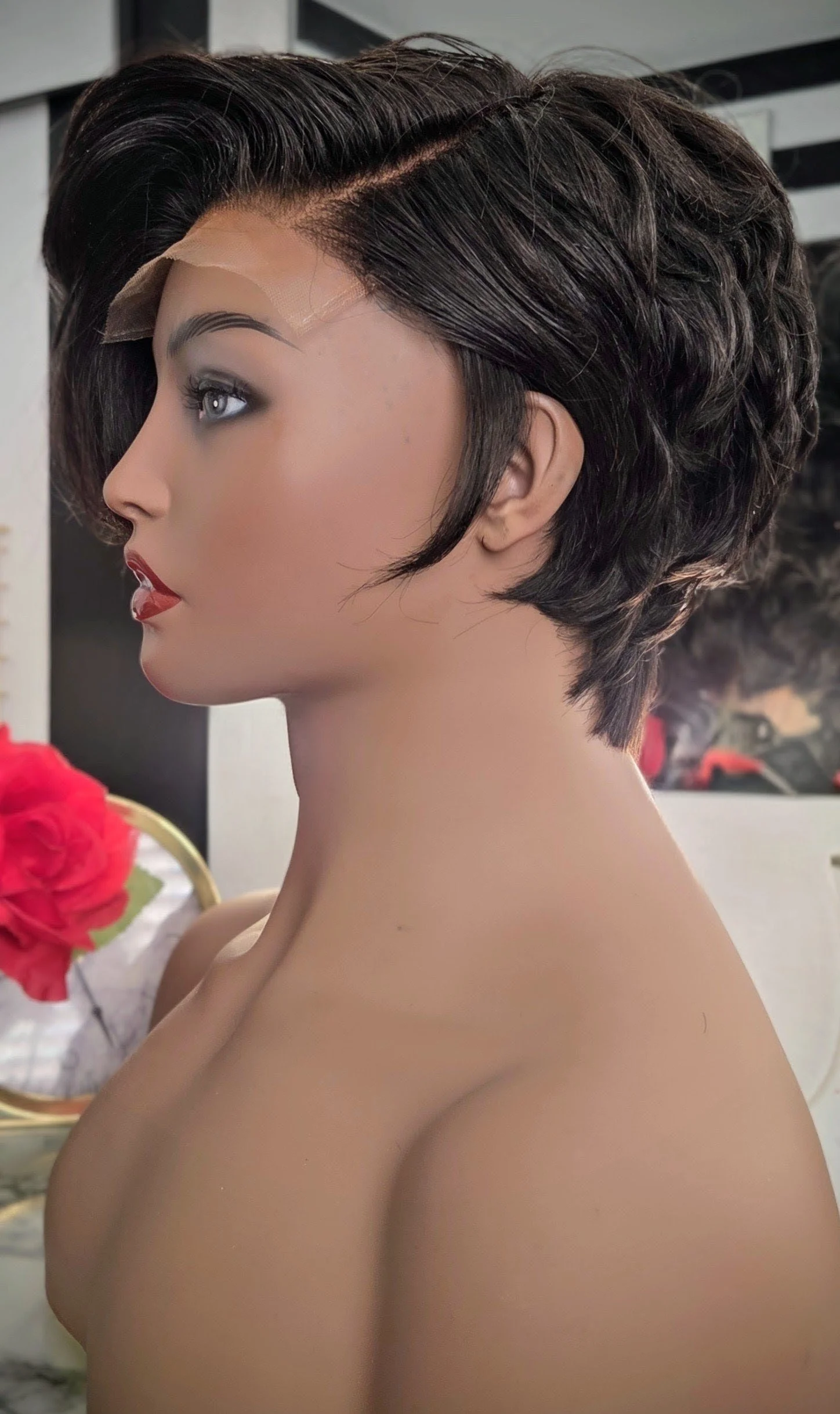 The Siren Pixie is constructed with a 5x5 HD lace closure for a natural-looking scalp and seamless blend, and is carefully created on a dome wig cap for durability and comfort.
